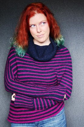 This asymmetrical stripy pullover is custom fit to your body, with a boxy, oversized, snuggly shape, in any gauge, and it can be worn in any direction! Get really different kinds of sweaters depending on your yarn weight, and on the density of your gauge.