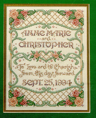 By Kooler Design Studio. This lovely sampler is a perfect keepsake for the bride and groom. They will remember the special day when they committed themselves to each other in marriage. You can stitch this design and present it as an heirloom gift that will be cherished for years to come.