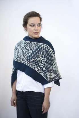 Japanese quilting and embroidery technique Sashiko became an inspiration for this elegant wrap. The central part is worked in Mosaic garter stitch. It means that knitter is always working with just one color in every row.