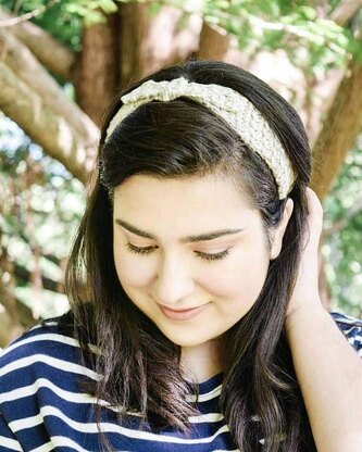 The headband is constructed vertically and in one piece, then tied around the head. It is easily adjustable to fit various head sizes by adding or subtracting rows from the body section.