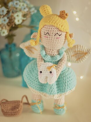 With this crochet pattern, you will be able to make your Tooth Fairy, the little tooth and the bag.