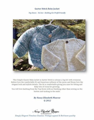 This Simple Classic Baby Jacket in Garter Stitch is always a big hit with everyone. Babies love the comfortable fit and luxurious softness of the yarns and Moms love the elegant look and stylish details. The fit is comfortable giving you ease for fitting and Baby lots of room for growing. You will love knitting from the Top Down with no finishing other than sewing on the button and tucking in the ends!