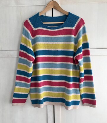 Der Pullover Rainbow ist von oben nach unten mit betontem Raglan gestrickt. Die breiteren Streifen sind in einer bestimmten Reihenfolge bestehend aus 4 Farben gearbeitet und werden jeweils von einem schmalen Streifen in einer hellen Kontrastfarbe unterbrochen.