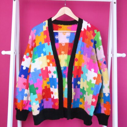 This is the perfect stashbuster for using up any mis-matched colours in your stash! Black rib bands make the bold coloured puzzle pieces stand out. The fronts and back of the body are knitted flat in one piece with bands picked up at the end. The colour work uses the intarsia method and can be worked in any colour combination you choose! Techniques include knit and purl stitches, intarsia colour work from a chart, increases and decreases and picking up stitches. This pattern is in multiple sizes to fit a chest/bust from 81cm/32in up to 122cm/48in. Pattern includes a full list of abbreviations, schematic, colour chart and a printable page for your notes.