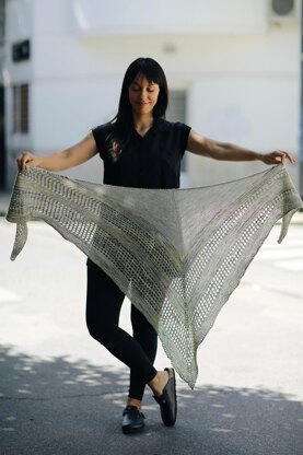 Tracie is a modern triangular shawl, with short rows that make it asymmetrical, and with a very deep V. It’s designed to show off your beautiful work and yarn, but it can also be worn all scrunched up around your neck.