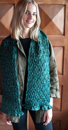 LENGTH: ca 63” / 160 cm MATERIALS: (3) hanks of Fiberspates Vivacious DK