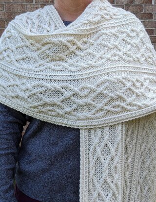 This is a pattern for an ornately cabled stole, which measures 14 3/4 x 74 inches. There are also instructions contained within the pattern for a narrow scarf, (7 inches wide), a large shawl (28 inches wide) and a more traditional shawl (21 inches wide) giving you the choice of what you’d like to make.