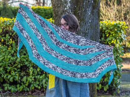 The sweeping curves of this shawl work equally well in two colors or one: with two colors, the effect is bold; with one, subtle. Which will be your trajectory?
