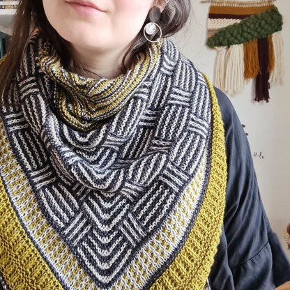 This triangle shawl is worked top down in various textured and slipped stitches motifs. While it blends three colours, only one is held at a time. With more increases on the edges, it's a balanced shape which creates a large, plump accessory.