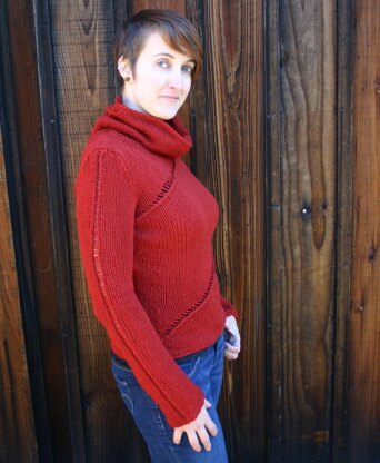 The meandering lines of eyelets in this sweater entertain both the eye and the knitter. Two lines of eyelets swirl around the body from hem to the top of the cowl, while a vertical line of eyelets runs up one sleeve and three bands of eyelets encircle the opposite forearm. The sweater is mostly knit in the round, with the set-in sleeves sewn in.