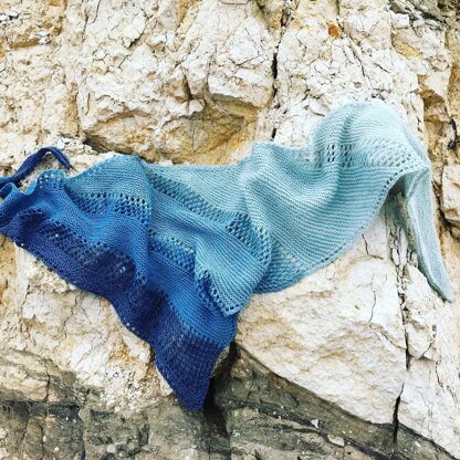This shawl is designed using a traditional asymmetric triangular construction. This is achieved by increasing and decreasing stitches at the beginning and end of rows. The breaking wave, sea surf effect is created by using double yarn over, knit two together stitches.