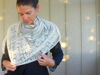 tread is a beautifully striped shawl with a lovely lace border (that reminded me of tire tread). tread is a hybrid: this shawl starts off as a triangular shaped shawl and then switches to a half circle shawl for the lace border.