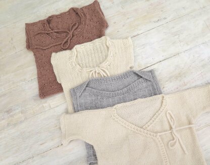 These cute little vests use different and easy stitches to create a cozy Wrap Vest (the wrap style construction makes it easy to get on and off), Ribbed Vest, Envelope Neck Vest (also designed for easy dressing) and Twinkle Star Vest your baby can wear throughout a variety of seasons. The cute I-cord ties add a nice touch, but can be omitted.