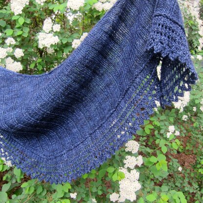 Treat is an asymmetric triangular shawlette knitted from side to side on the bias. It is completely reversible, featuring wide ribbing and a pretty lace edging. Although the pattern calls for fingering-weight yarn, you are free to substitute heavier or lighter yarns.