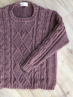 Aran diamonds, interesting cables, bobbles and broken rib combine to make this beautifully unique, easy fit sweater. Worked bottom up and with full written instructions. Alternative yarns to have a look at could be King Cole Wool Aran or West Yorkshire Spinners The Croft Aran, but always be sure to test your tension and if needed, adjust needle size.