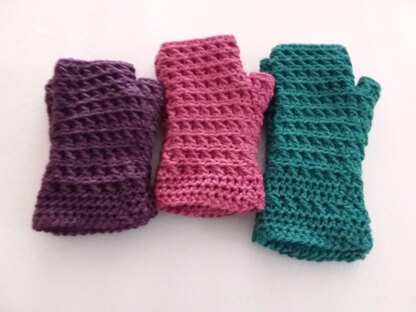 These cute, comfortable, textured and squishy fingerless gloves are designed to fit a medium lady’s hand.
