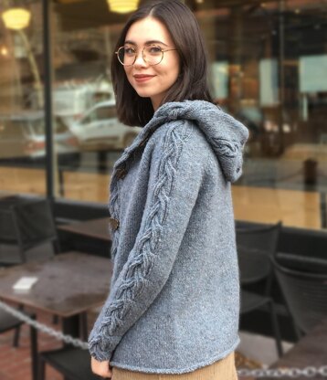 Unusual plaited cables add interest to this raglan cardigan, edging the fronts and running up the sleeves to the top of the shaped hood. The reverse side of the cables is also attractive, and is displayed when the hood is worn down, at the transition from fronts to hood.