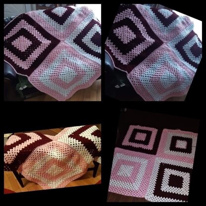 This simple but elegant throw is worked in rounds and is made using 4 large granny squares using three (3) colours in different combinations which are joined and a simple border added.Written in US terms