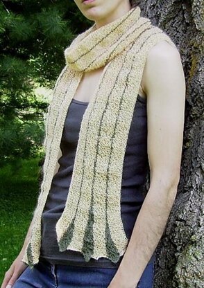 As written, the pattern will produce a lightweight scarf approximately 5" wide by 6 feet long. However, by varying the number of stitches cast on, the number of garter ridges in each main-color stripe, or the weight and gauge of the yarn used, the size and texture of the scarf can be varied almost infinitely.