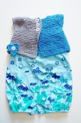 Trolltyg Mini is worked from the top down in worsted or aran weight yarn. Two pieces are worked separately, to be joined with either buttons or ties. Add a cute crochet flower at the hem if desired!