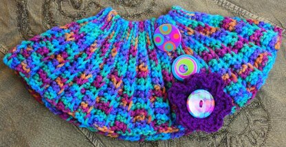 The beautiful texture of this neckwarmer is created with a graduated ribbing. Slip stitches are worked at the neckline, then single crochet, then half double crochet, and finally double crochet stitches. The graduated stitches give the neckwarmer its circular shape. The neckwarmer closes with large funky buttons highlighted with a purple flower at the lower edge. This neckwarmer will keep cold winds away from your neck in style all winter long. A bright and fun addition to any wardrobe!