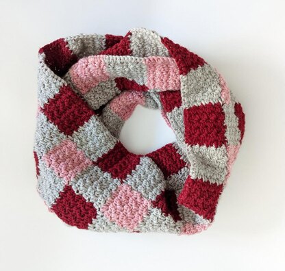 To create the checkered look, alternating colours are carried under your stitches throughout the rows in this pattern. If you’ve never tried carrying yarn across, this pattern is a great opportunity to try it! Once the length of the scarf is finished, it is sewn together in a loop. You’ll add a single crochet border on both edges to hide your carried stitches up the sides.