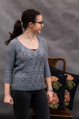“Trussed and Twisted” is a top for all those who love intriguing details. A deep neckline finished with I-cord, an unusual, symmetrical cable and openwork stitch pattern, accentuated false “seams” and interesting constructions create a garment that will satisfy every knitting adventure explorer. The design of the sweater, with a classic shoulder line positioned further back, has been modernized here, and the sweater is knitted in one piece, completely seamless. After knitting a few rows on the back piece, stitches are picked up for the front and sleeves, after which proper shaping starts, and the sweater is worked down to the ribbing. The modern, slightly cropped length of the sweater and ¾ length sleeves of the original are easy to change and adjust to your own preferences. The pattern is written in 11 sizes from XXS to 4XL, with separate charts for the Fronts. To save paper, print only the pages you need for your size.
