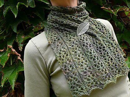 This scarf features a twining openwork chain pattern in neat vertical repeats like climbing roses. A simple six-row repeat with lace knitting on the right side only, this one knits up quickly and makes a great on-the-go project using any soft sock weight or sport yarn.
