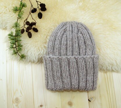 **Design details:**● a beanie with a folded brim ● worked in the round from brim to crown ● ribbed pattern ● integrated flat shaping