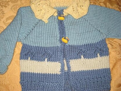 This raglan sweater is knit top-down from Lace collar to waist band, no seams, no sewing. Fun, fancy and fast to knit. The instructions are clear. Details include: I-cord band, knit in buttons and tulip pattern. This can be knit all one color or multistripes. Martha Stewart extra soft wool blend (35% Wool, 50g/ 181 yds): Main color A #507 winter sky 2 ( 3, 3, 4, 4, 4) skeins Color B 1 skein #557 lemon chiffon Color C 2 skeins #508 blue corn Color D 1 skein #555 celery