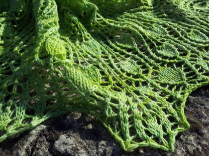 While hiking the Appalachian Trail on an April morning, leaving from a valley lush with the green of spring, it was hard to ignore that the higher the trail climbed, the less green it got and higher up trees and branches had fewer and fewer leaves, some not having put forth any growth at all. The shawl depicts the tulip tree as it starts to burst into life in early spring. Starting with the leaves, the unopened buds higher up and finally the border representing the highest branches with the flowers in all their splendor!