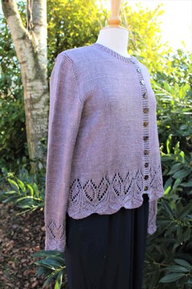 Tulipan is a short/slightly cropped cardigan worked from the bottom edge and up with a nice lace pattern at the bottom of the body and sleeves. The cardigan has long set in sleeves (the yoke is worket in one piece / raglan construction).