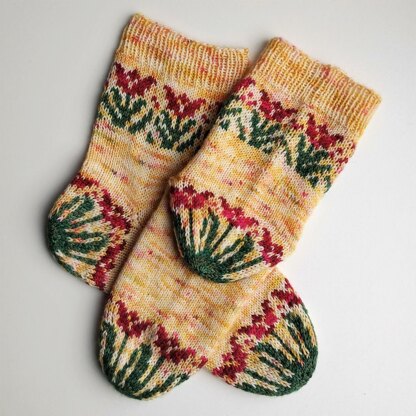 Stranded colorwork makes nicely cushioned toes and heels to give you comfort and a spring in your step. Socks are worked cuff down with a non-standard after-thought heel. Size refers to sock foot circumference.