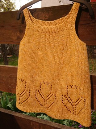Sweet little top inspired by the ever changing spring. Worked in the round with simple lace tulips. I chose wool-cotton blend yarn, but any fibre will do perfectly. Just be aware of the stretching specifics of the different yarns.