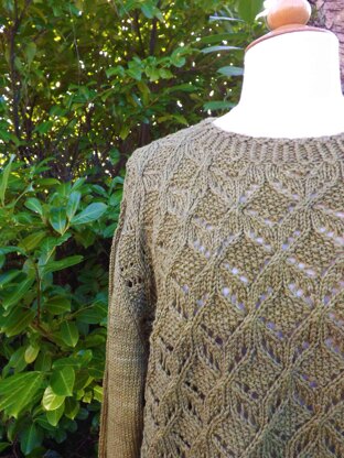 Tulre is a pullover worked from the bottom edge and up with a textured lace pattern on the body. The pullover has long sleeves with a combined raglan/modified drop sleeve construction.