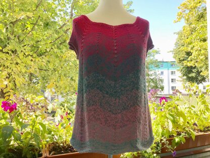 Diese Tunika wird in Runden von oben nach unten gestrickt. Ein wohl durchdachtes Zusammenspiel von Zu- und Abnahmen lassen ein schlichtes und dennoch fantasievolles Werk entstehen. Stricke dir deine Sommernacht....