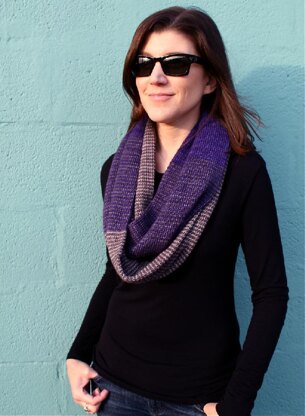 A circular tubular infinity scarf with color blocking and stripes traveling through each other. Pattern includes instructions for three sizes and multiple gauges, so is easily customizable to any weight yarn.