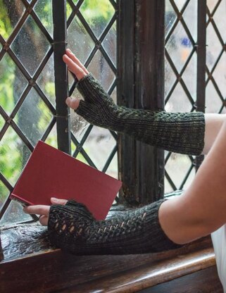 The Twilight Flowers Mitts are a pair of fingerless mitts featuring a lace panel down the back of each hand. Knit with sport-weight yarn, the mitts share the sleeve lace pattern of the Twilight Flowers pullover.