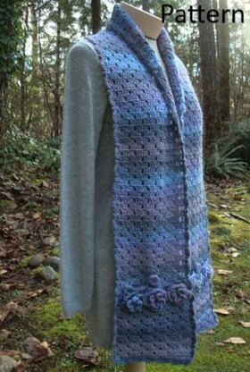 A generously sized scarf that is crocheted in four easy pieces. A strip for the front and back and two pockets. The pockets are trimmed with beautiful flowers and a shell and picot edging across the top. The same shell and picot edging is crocheted around the outside of the scarf while at the same time joining the pockets. Crocheted buttons for fastening the pockets add just a little bit more embellishments for a couture look.