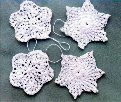 A scalloped edge ornament, or pointed end ornament. Either one is easy to knit! Something a bit different in start ornaments. You could also use these for coasters! Use as package trims and Holiday decorating too! Finished size is about 3 inches. Uses crochet thread and knitting needles, US # 5.