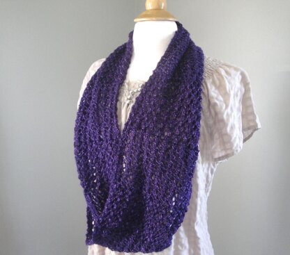 Twinkle is a chic infinity scarf with a moebius twist, using a sparkly yarn and easy lace pattern.