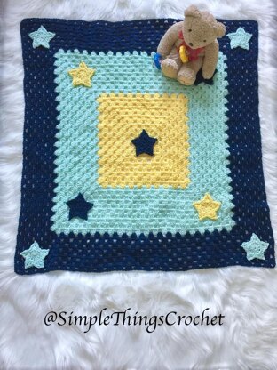This easy granny square blanket is made extra special with the addition of the appliqué stars. These colors highlight each other so well that they make the stars pop against the simple background. You can make as many stars as you like and scatter them about freely. They would even make a nice garland to hang in baby’s room! The blanket measures 31" square but is easy to adapt. You will need 3 skeins of Lion Brand Anti-Pilling Yarn in Steel Blue, 2 skeins in Frost, and 1 skein in Lemonade.