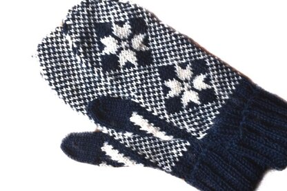 This is a simple colourwork mitten that comes in one size to fit an average ladies hand.