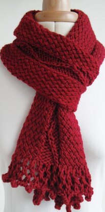 This scarf is made of a combination of twisted stitches either side of a snaking single cable, with a soft lacy frill to the ends. The twisted stitches create a thick fabric which makes the scarf very warm. The twisted stitch takes a little getting used to but is relatively easy to do, once you have completed a few rows you will have found a good rhythm. I made one sample using Bergere de France Magic+ and one sample using Mirasol Miski (which is wonderfully soft), but any worsted, double knit or aran would work just as well. I recommend a slightly larger needle than you would normally use as the twisted stitch works better with large needles. The finished size is 150cm (60 inches) long by 17cm (7½ inches) wide when blocked. The size is easily adapted and the scarf could be made with a plain edge. Information on how to do this is included in the pattern.