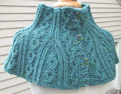About The Design: This design began as a single-sized neck warmer, worked in a hand-dyed cashmere aran weight yarn. I’ve expanded the sizing, and introduced it also as a shoulderette (warmer). Whether buttoned or a pullover, it will chase autumn’s cool nights, as an option to a shawl, then come winter, wear it over a thick sweater or jacket, for extra warmth and panache.