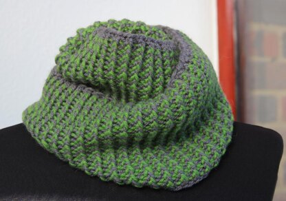 This is a very easy cowl to knit and very easy to wear. It is knitted in a twisted rib, but only with knitting though the back loop, no purling tbl! It is stretchy, soft and warm.