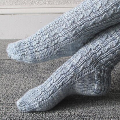 These highly textured socks use slip-stitch cabling to create flat twists and braids that are mirrored on front and back of the sock from the center. When worn the sock stretches to reveal the beautiful detail of the ribs. Socks knit from the cuff down.