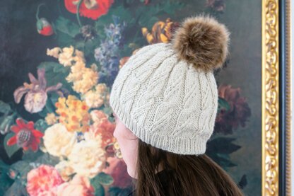 This cable knit hat pattern has a delightful texture due to its twists and cables. The sewn-on pom finishes it perfectly.