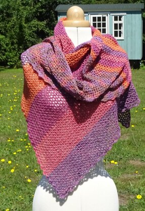 TWITS was inspired by Countess Ablaze.  It is a sideways, asymmetrical, triangular shawl design which can be made to any size and with any yarn.  The edge is made as you work and once you crochet the last row you are finished!    Two 100g skeins of 4ply yarn will make a shawl approximately 200cm by 60cm.  This design works well in variegated yarn and also in stripes.  With 2 different skeins, either do 2 large blocks of the colours or stripes of varying widths.