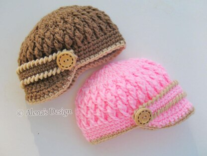 Includes PATTERNS for the Two-Button Baby Visor Hat in four sizes: